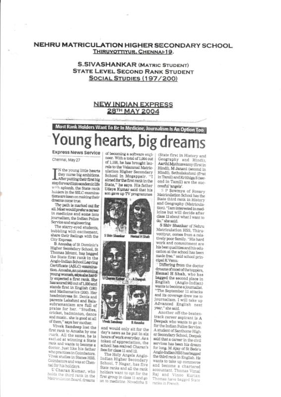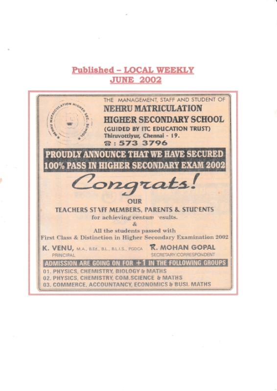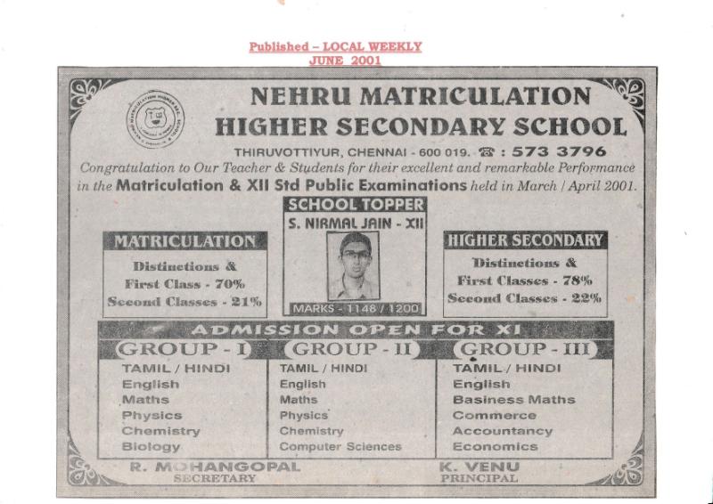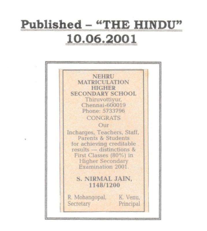 Nehru Matriculation Higher Secondary School, Thiruvottiyur, Chennai – 19 has consistently achieved outstanding academic results, securing 100% pass percentage in Higher Secondary Board Examinations across multiple academic years, with the majority of students obtaining First Class and Distinction. In 2001, the school proudly celebrated the success of S. Nirmal Jain, who scored 1148/1200 and emerged as the School Topper, earning special recognition and publication in The Hindu (10 June 2001) and Local Weekly Journal (June 2001) for contributing to an exceptional overall performance of 80% First Classes, along with 78% First Classes and 22% Second Classes in Higher Secondary and 70% First Classes and 21% Second Classes in Matriculation. Continuing the legacy of excellence, the school received wide appreciation again in 2002, with an announcement in Local Weekly (June 2002) for securing Centum / 100% Pass Result in Higher Secondary, where all students passed with Distinction and First Class, further strengthening the school’s academic reputation. In 2004, S. Sivashankar brought further pride to the institution by securing State Level Second Rank in Social Studies with 197/200, and his achievement was featured in The New Indian Express (28 May 2004), where his dedication and the school’s support were highlighted. Throughout these years, the combined hard work of the Principal, Secretary, Teachers, Staff, Parents, and Students played a major role in building the school’s strong academic tradition and statewide recognition.